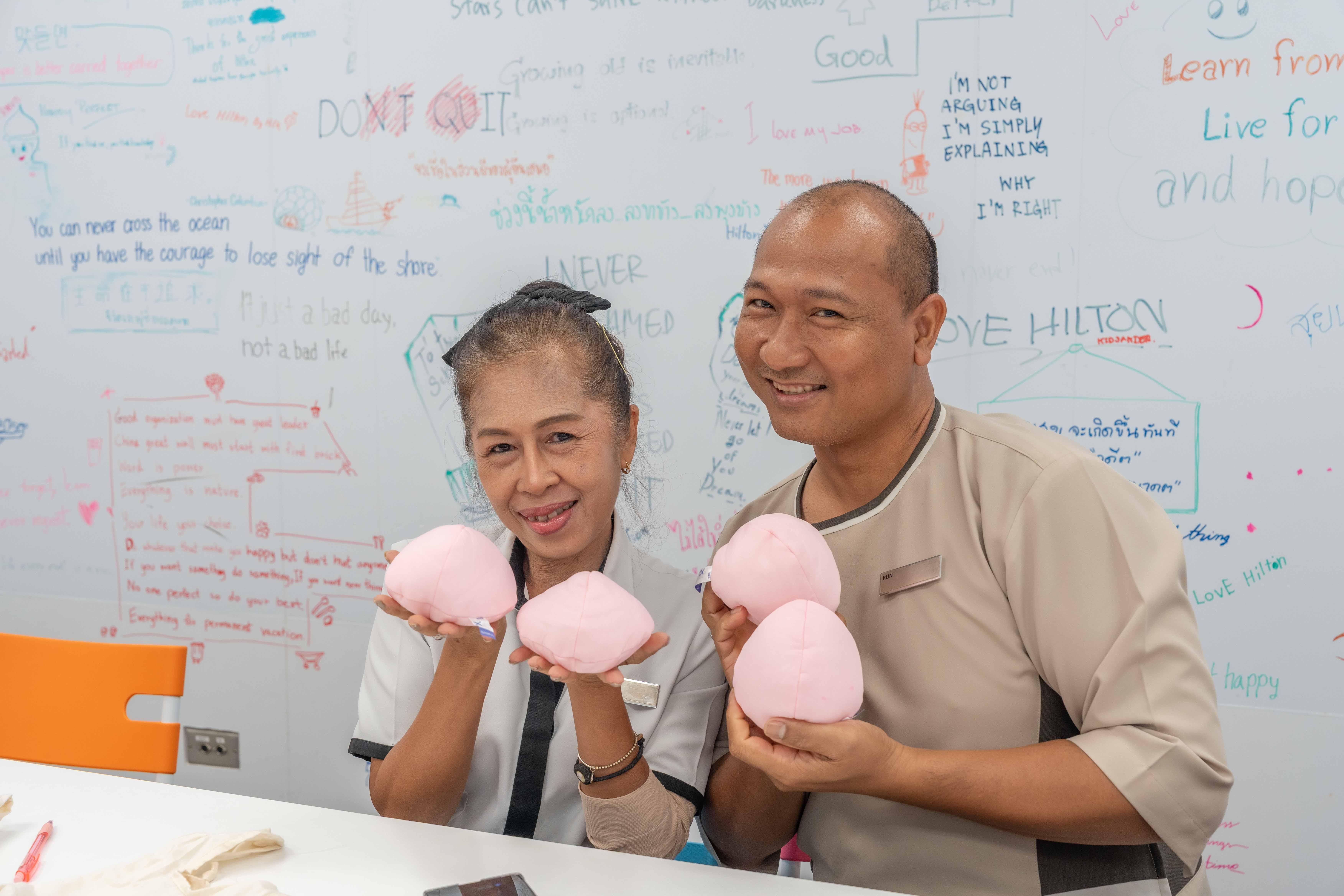 นอกจากนี้ ซาบีน่ายังได้สนับสนุน “แผ่นฟองน้ำจำลองเต้านม” เพื่อใช้เป็นสื่อการเรียนรู้ในการฝึกตรวจเต้านมด้วยตนเองอย่างถูกวิธี ให้กับผู้เข้าร่วมกิจกรรม เพื่อสร้างความตระหนักรู้เกี่ยวกับโรคมะเร็งเต้านม ภายใต้แนวคิด “รู้เร็ว รักษาได้”