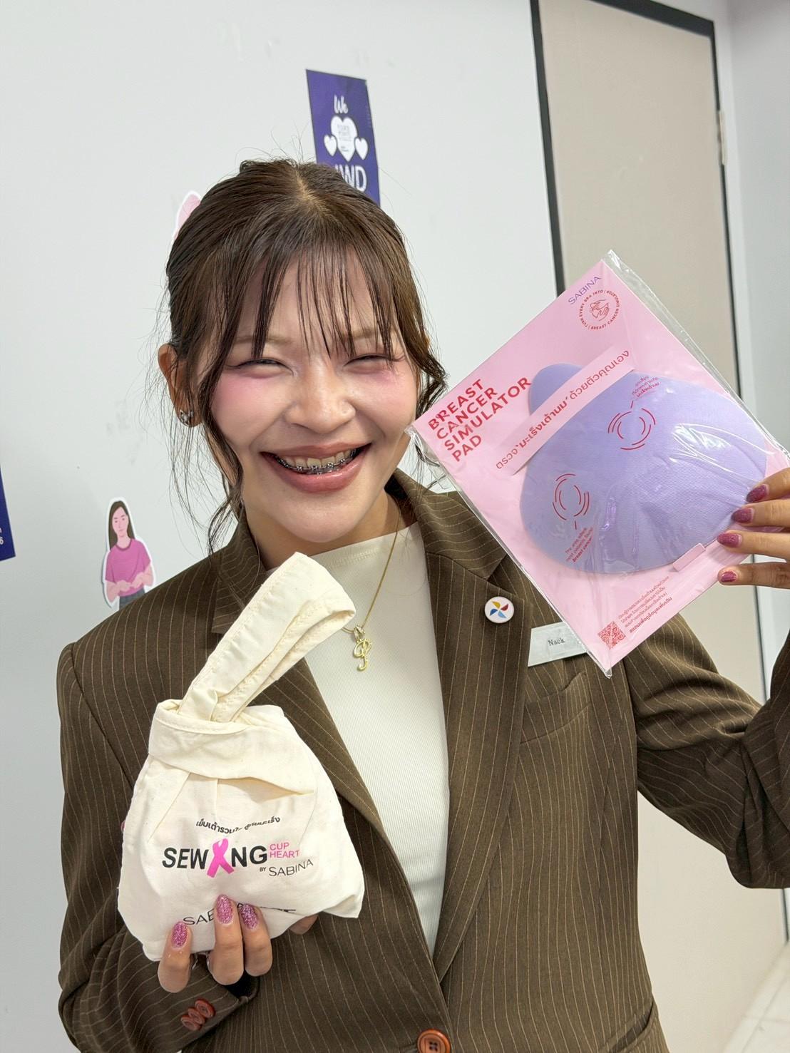 นอกจากนี้ ผู้เข้าร่วมกิจกรรมยังได้รับ แผ่นฟองน้ำจำลองสำหรับเรียนรู้การตรวจเต้านมด้วยตนเอง เพื่อเสริมสร้างความรู้และความตระหนักในการดูแลสุขภาพ ภายใต้แนวคิด “รู้เร็ว รักษาได้” ซึ่งช่วยส่งเสริมให้ผู้หญิงหมั่นตรวจเต้านมด้วยตนเองอย่างสม่ำเสมอ กิจกรรมดังกล่าวสะท้อนถึงความมุ่งมั่นของซาบีน่าในการร่วมเป็นส่วนหนึ่งของการสร้างสังคมแห่งการดูแลและส่งต่อกำลังใจให้กับผู้ป่วยมะเร็งเต้านม พร้อมทั้งสนับสนุนการให้ความรู้ด้านสุขภาพแก่ผู้หญิงไทยอย่างต่อเนื่อง